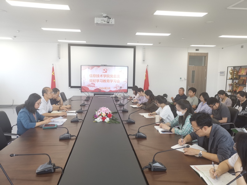 为深入学习贯彻习近平总书记关于党纪学习教育的重要讲话和重要指示精神,认真落实学院党委关于党纪学习教育的工作要求,以严实作风抓好落实,确保学习教育取得实效,信息技术学院党总支于5月8日召开党纪学习教育专题学习会,会议由党总支书记莫淦清主持,全体教工党员参会。
