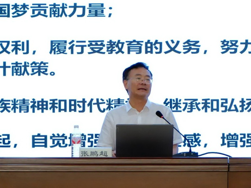 会议的第一项议程,由学校党委委员、副校长张鹏超讲授新生第一课。张鹏超以“纪念中国人民抗日战争暨世界反法西斯战争胜利80周年”为切入点,引领新生重温历史、砥砺初心,勉励大家胸怀家国、勇担时代使命。随后,张鹏超对学校、学院的基本情况进行了详细介绍。他表示同学们应该明大德,做一个有道德的人;强素质,做一个有修养的人;增能力,做一个有本事的人。他鼓励新生具体要做到以下六点:第一,晚上不熬夜,十一点前睡;第二,早晨不赖床,六点半起床;第三,上课不迟到,八点一刻前到;第四,平时不懒腿,坚持锻炼身体;第五,手机不成瘾,不过三小时;第六,书本不离手,坚持读好书。